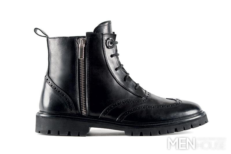 Bundy v motorkářském stylu a bombery z kůže a plstěné vlny jsou pokryty smaltovanými, kovovými nebo koženými aplikacemi a odznaky připomínající vojenské uniformy. Parky z bavlny a kompaktního nylonu ve stylu uniforem jsou lemovány ovčí kůží. Úplety s plastickými vzory vyplněné aplikacemi, některé s leštěným provedením, dodávají kolekci grafický a sportovní look. Černé leštěné zavazovací boty z teletiny a kotníkové “Chelsea” boty jsou na patě a špičce zdobeny lesklými kovovými aplikacemi dodávajícími vojenský vzhled.