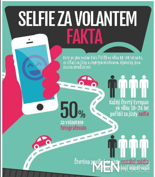 • Průzkum sponzorovaný společností Ford ukázal, že čtvrtina mladých řidičů se už někdy vyfotografovala za volantem; polovina z nich připouští, že se tak stalo za jízdy