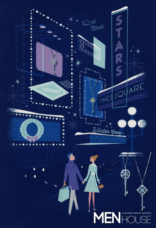 CO: „Letošní vánoční výlohy jsou inspirovány energií a sofistikovanou atmosférou města New York v 50. a 60. letech minulého století,” říká Richard Moore, viceprezident pro Creative Visual Merchandising, Tiffany & Co. „Stejně jako dnes byl tehdy Tiffany nejlepším a nejslavnějším klenotníkem, stojící vždy na špičce módy a designu. Styl a entuziasmus té doby jsme zachytili do vtipných ilustracích rodin a párů užívajících si vánoční glamour a zářivou atmosféru zasněženého města.”