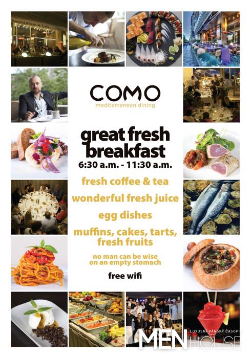 COMO vám pomůže nastartovat den širokou nabídkou skvělých byznys a fit snídaní. Pokračovat můžete obědovým menu, které šéfkuchař Dušan Mackovič připravuje z čerstvých a sezónních surovin. Pracovní den můžete v COMO zakončit u skvělého bifteku se sklenkou červeného vína za poslechu vždy příjemné hudby. Vypadá to, že ať si dáte v COMO cokoliv, ať jste vegetariáni nebo máte bezlepkovou dietu, vyberete dobře.