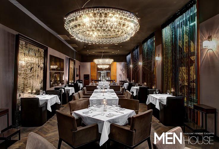 OSLNIVĚ ŽLUTÁ a prosvětlené místnosti s krémově smetanovými a šedými křesly odešly do říše čerstvých vzpomínek a z inspirativních návrhů šikovné kanadské designérky se zrodila hnědošedá vznosná síň prodchnutá očekáváním, co zvláštního a neobvyklého se přihodí. Je to však atmosféra poklidného tušení, neboť tmavě hnědá na podlaze, stropě a kožených křeslech vás uvádí do pocitu pokoje, důvěry a bezpečí. Neutrální šedá na stěnách oživuje místnost světlejším odstínem a velká zrcadla složená z jakoby pochroumaných zlatých desek přidávají prostoru unikátní vznosnost. K té je třeba připočíst fascinující lustry Arctic Pear od britského studia Ochre a již zmíněná zrcadla od českého skláře Jakuba Janďourka. Díky moderním lustrům, bílým ubrusům a čirým malým svítilnám na stolech pak dojdete k jednoduchému zjištění, že to nejpodstatnější zde jste vy, jako hosté, a vše to, co si objednáte.