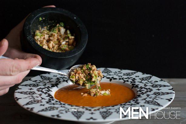 Postup: Rozehřejte si troubu na 160 °C. Na pekáč vyložený pečicím papírem položte papriky, lilek a nakrojená rajčata. Pečte cca 25 minut. Kešu dejte do nádoby na pečení a vložte do trouby. Pečte cca 15 minut do hezké hnědé barvy. Nakrájejte si jarní cibulku. Vychladlé opečené kešu rozdrťte v hmoždíři s kapkou olivového oleje. Rozdrcené a osolené kešu smíchejte s jarní cibulkou a dejte stranou. Oloupejte cibuli a nakrájejte ji na malé kostičky. Na rozehřátém másle ji nechte zesklovatět. Přisypte červenou papriku a zvolna orestujte. Pokud byste pekli papriku na vysokém plameni, zhořkne. Zalijte vodou nebo vývarem. Z trouby vyndejte rajčata a vykoupejte je ve studené vodě. Vyřízněte „bubáka“ a vhoďte do základu polévky. Papriky s lilkem vyndejte z trouby. Svlékněte je ze slupky a očistěte od vnitřních semínek a stopky. Vložte do základu polévky. Lilek zbavte stopky, rozkrájejte a vhoďte do základu polévky. Směs chvilku povařte a následně rozmixujte na jemný krém. Dochuťte česnekem, solí, pepřem, tymiánem, případně papričkou habanero. Pokud se vám bude zdát polévka kyselá, doslaďte ji cukrem.