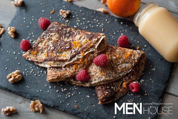 Postup: Do misky dejte mouku, vejce, máslo, med, sůl a ingredience smíchejte v husté těsto. Následně rozřeďte mlékem na lité těsto. Tím zajistíte, že těsto nebude mít hrudky. Na rozpálenou pánvičku dejte máslo, vhoďte hrst chia semínek a zalijte těstem. Opečte palačinku z obou stran do zlatova. Následně palačinku potřete medem, jogurtem, dejte na ni maliny a posypte mletými či drcenými ořechy. Palačinky servírujte přeložené a doplněné o pomerančovou kůru nebo zmrzlinu.