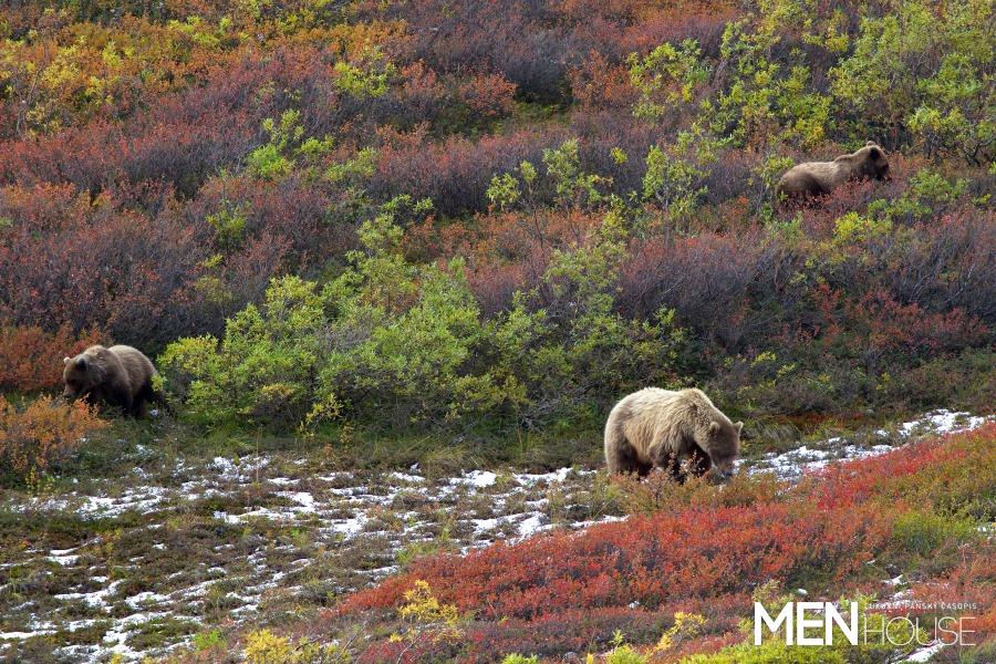 Sbalili jsme stan a vyrazili ke vstupu do parku, kde jsme prošli tréninkem pro pohyb v divočině, bez kterého nelze nocovat mimo kempy. To byl náš sen - zažít tu pravou aljašskou divočinu se vším všudy. Už víme, že když nás napadne medvěd černý, musíme s ním bojovat a snažit se ho zastrašit. Zatímco u grizzlyho je lepší spíš předstírat nezájem a rozhodně neutíkat. Medvěd vás instinktivně začne honit a běhá podstatně rychleji než vy. Nemáte šanci. Ale takovému losovi, který je mnohdy díky své jednoduchosti nebezpečnější než medvěd, utečete. Jen nesmíte běžet rovně, ale cik-cak. Naše první setkání s medvědem na sebe nenechalo dlouho čekat. Projížděli jsme úsekem silnice čerstvě otevřeným po sněhové bouři a hned před námi se ve sněhu povaluje grizzly. Srdce nám buší o stošest a fotíme přes přední sklo autobusu, dokud to méďu nepřestane bavit a zmizí ve stráni u cesty.