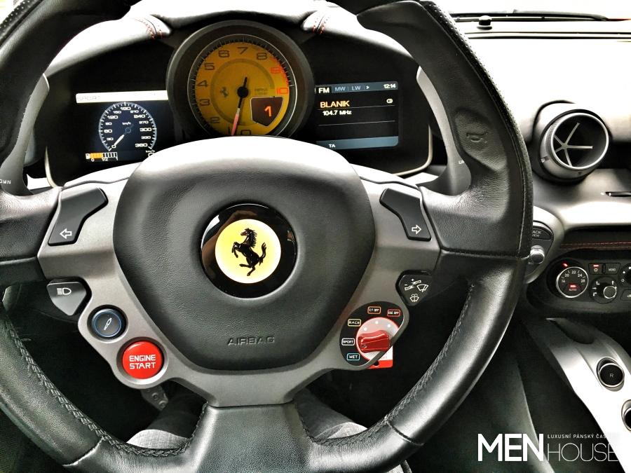 Adrenalin na maximu a další rovinka, která se zkracuje nepřiměřeně k vnímání reality a znovu tvrdě do brzd a ostrá levá, kde poprvé cítím, že motor je vpředu a má chuť jít předními koly napřed. Nicméně plyn neubírám a jen jemným srovnáním řízení a následně méně strmým úhlem projíždím bezpečně zatáčkou a nyní plný plyn před výjezdem, a to už elektronický pomocník trakce drží jen stráž, ale nezasahuje a já nechávám na asfaltu nesmazatelnou stopu o přesně 305 mm šíře. Ten výkon je natolik omračující, že si netroufám manettino otočit do polohy OFF. Tohle auto je za limitem mých řidičských schopností a patří opravdu jen do zkušených rukou a hlavně vyrovnané mysli. Když jdete na maximum, umí 350 km/h, a to už je vzletová rychlost Boeingu 747! Zvolňuji a rovnám si tep do normálu. Řadím 7 rychlostní stupeň a courám se 200kou po okreskách. Ano, ta potvora, je opravdu posunutá z běžných měřítek všeho, v čem jsem kdy seděl. Dokonce si troufám říct, že by dala i většinu motorek na okreskách. Přijíždím do Prahy a vracím se do reality a dodržování předepsaných rychlostí. Užívám si ten jedinečný zvuk a zájem okolí. Vždy, když nějací kluci na křižovatce ukážou palec nahoru a čekají se mnou na zelenou, dám jim ten zvuk skutečného Ferrari v 8000 otáčkách, na který budou vzpomínat celý život, jako si to z dětství vybavuji já.