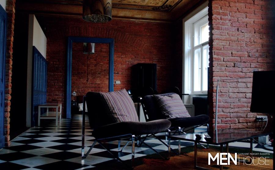 Sedáme si do křesílek v obývacím pokoji. Ten tvoří centrum tohoto podlouhlého příbytku. Vstřebat nové okolí trvá trochu déle, než když například přijdete ke známému na návštěvu do nového bytu. Pořád ne a ne si místo zařadit do nějakého konkrétního šuplíčku, vzniklého na základě předchozích zkušeností. Má hlava zamíří směrem vzhůru. Žlutavé stropy jsou pokryté malbami, na jaké jsme zvyklí ze zámků. Z nich visí dlouhé chromované lustry, kombinující moderní minimalismus s honosnou secesí, čímž na stropy částečně navazují.