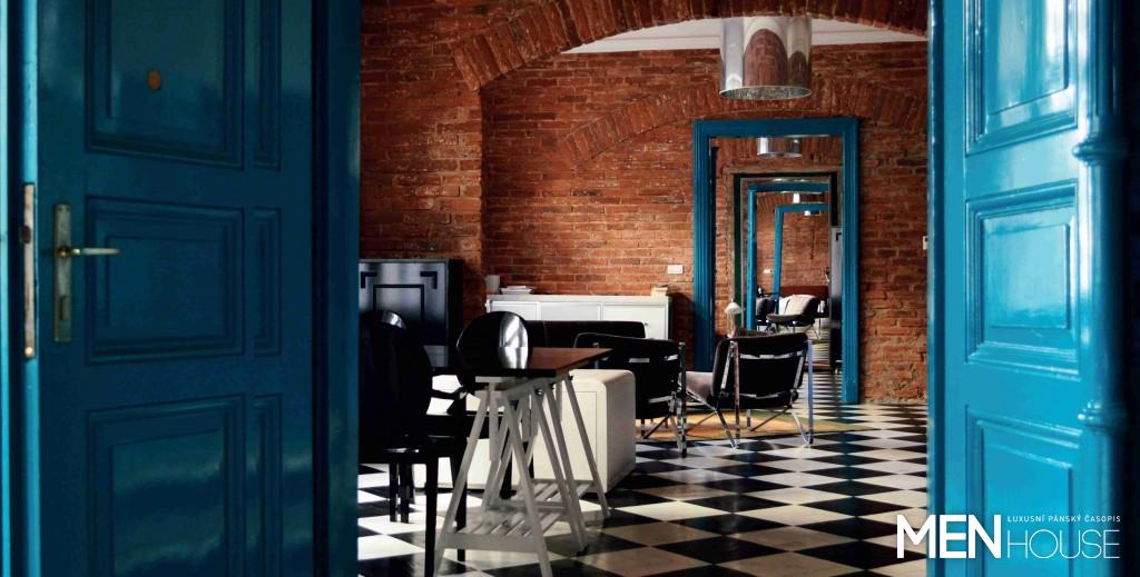 Ze syrových stěn nepřehlédnutelně vyčnívají tyrkysové zárubně velkých létajících dřevěných dveří. Ty jsou evidentně ve stylu shabby, podobně jako skřínka u kuchyně. Tento styl, známý z velkých amerických domů, dodává místu na přirozenosti, a to díky přírodním materiálům a lehkým barvám. Podlaha v nás vyvolává zvláštní pocit, že jsme figurkami na obrovské šachovnici. Černobílá políčka se táhnou po celé ploše prostoru a díky zrcadlům na zdech ložnic, nacházejících se na obou koncích podlouhlého bytu, se iluze obří plochy ještě několikanásobně prohlubuje.