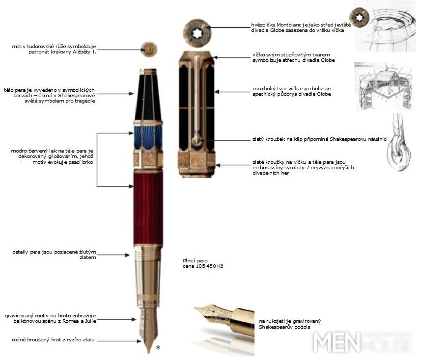 Na zlatých kroužcích na těle a víčku pera jsou embosovány symboly jednotlivých her a na konci pera je embosována tudorovská růže jako symbol patronátu královny Alžběty I. Na zlaté rukojeti pera je gravírovaný podpis Shakespeara. Modrá barva na těle pera se odvolává na tzv. královskou modř, barvu, kterou v Shakespearově době nosila šlechta a příslušníci královského dvora. Na ručně broušeném hrotu z ryzího zlata je gravírovaný motiv balkonové scény z Romea a Julie. Číslo vyryté na víčku pera je dokladem jedinečnosti každého kusu.