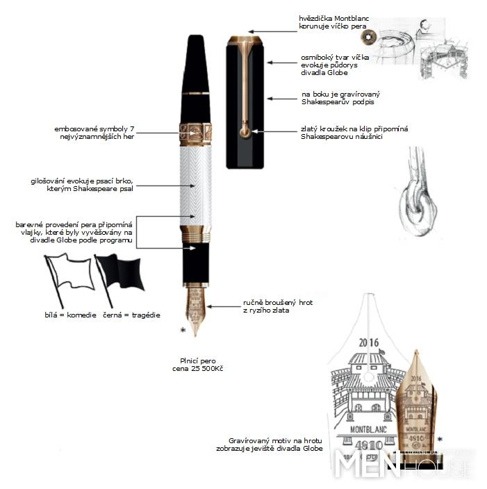 půdorys divadla Globe. Barevnost kolekce odpovídá světu Williama Shakespeara a zlaté detaily jsou dekorovány symboly představujícími jeho nejznámější hry: růže a dýka symbolizují Romea a Julii, lebka Hamleta, dvě šachové figury krále Leara, erb Jindřicha V., koruna Macbetha, mrak Bouři a vavřínový věnec Caesara. Zlatý kroužek na klipu pera připomíná Shakespearovu náušnici zvěčněnou na Chandosovské malbě, nejznámějším portrétu slavného umělce.