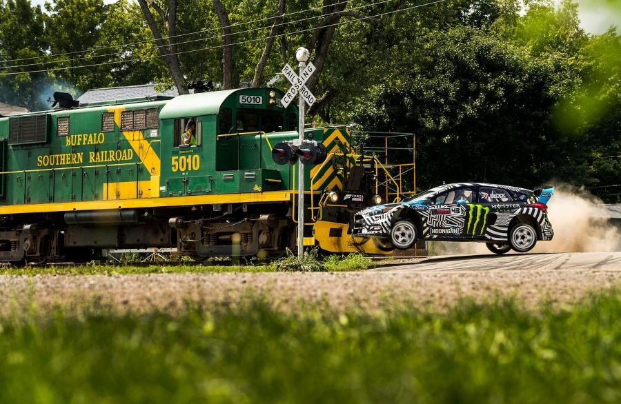 „Mimochodem,“ řekl Block. „Tohle je asi všem jasné, ale abychom si rozuměli, prosím, prosím, prosím, nikdy nezkoušejte žádné z triků, které mě uvidíte předvádět v tomto videu. Zvláště pak zkusit předjet vlak. Pokusit se projet před vlakem není jen hloupé, ale také nelegální. Tak to prosím nedělejte. V mém případě se jednalo o uzavřený areál s bezpečnostní posádkou, koordinátory a perfektně připraveným plánem!“