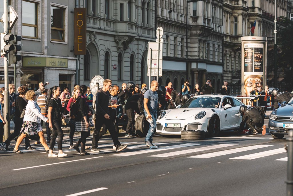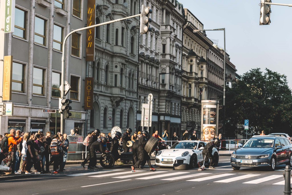 Výměna pneumatik, natankování paliva, boj s časem o každou setinu sekundy – scénu jako z boxů elitních závodů Formule 1 dnes zažili přihlížející na Pražské magistrále. V 16:30 totiž na světelnou křižovatku k modelu bílého Porsche GT3RS stojícího na červené přiběhlo devět mechaniků v černých kombinézách, kteří luxusnímu vozu začali bleskově vyměňovat pneumatiky. Celá akce připomínající atmosféru skutečného pit stopu trvala přibližně 41 sekund, tedy dobu, než na semaforu padne zelená a nabídla tak náhodným kolemjdoucím nečekaný adrenalinový zážitek.