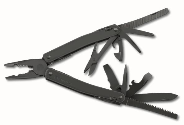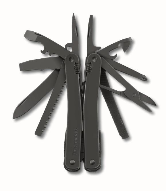 Swisstool je jako bedna s nářadím – najdete v něm nejen kleště, šroubovák, nůžky a otvírák na lahve, ale také dláto, šídlo a dokonce i pilku na dřevo nebo železo. Nová verze se vám představí v elegantním černém kabátě, s PVD povrchovou úpravou. Pro pohodlné uložení je navíc prodáván s praktickým pouzdrem šitým na míru.