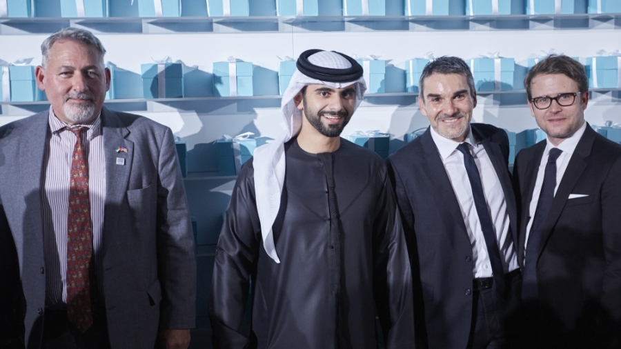 The Iconic Burj Khalifa lit in the legenadary Tiffany Blue, Tiffany & Co.Sculptural structure of Tiffany flagship boutique on 57th Fifth Avenue, Tiffany & Co.Sculptural structure of the Empire State building, Tiffany & Co.Nour Arida, Tiffany & Co.Deema Al Asadi, Tiffany & Co.Elias El Indari, Tiffany & Co.Turkish celebrity Burcu Esmersoy, Tiffany & Co.HH Sheikh Mansour, US General Consul, Marc Jacheet GVP Tiffany and Renaud Pretet VP Tiffany, Tiffany & Co.