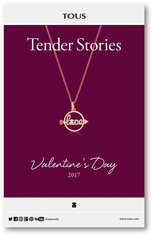 Letos medailonek ke dni svatého Valentýna nese motiv Amorova šípu s nápisem „láska“ a legendárního medvídka Tous. Kolekce nabízí přívěšky, náhrdelníky a náramky z ušlechtilých materiálů: stříbra, růžovým zlatem zlaceného stříbra s drahokamy a samozřejmě i osmnáctikarátového žlutého zlata s perletí nebo diamanty.