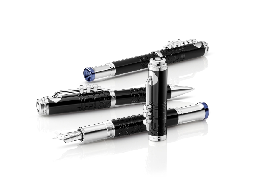 ve tvaru trubky, které je mistrovským dílem rytců uměleckého ateliéru Montblanc. Na platinovém víčku a těle pera jsou zobrazeny