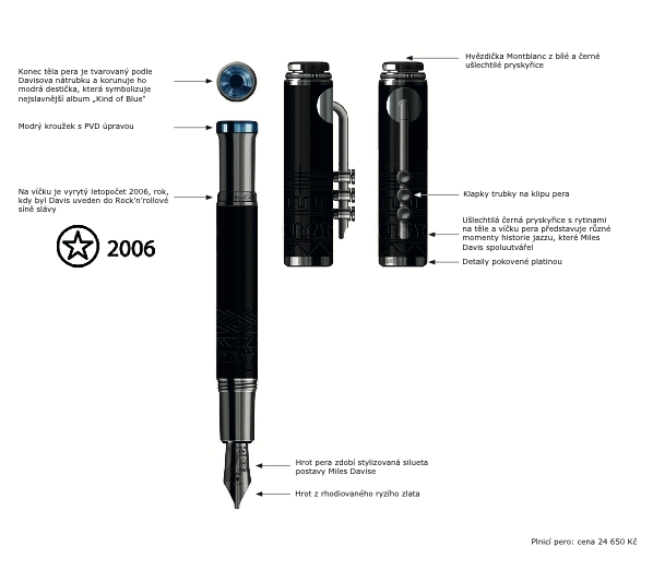 grafické symboly žánrů, se kterými Davis pracoval. Modrá plocha prosvítající výřezy v těle pera připomíná jeho nejzásadnější album „Kind of Blue“. Na plnicím peru i rolleru jsou detaily inspirované životem a dílem hudebního génia