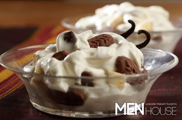 Banán nakrájíme na menší kousky a tupou stranou nože vyškrábeme z vanilkového lusku semínka. Vše promícháme spolu s jogurtem se sušenkami a zakysanou smetanou.