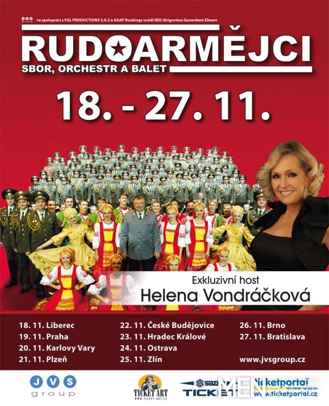 Jako exkluzivní host vystoupí Helena Vondráčková se svým repertoárem, ke kterému Rudoarmějci již pilně připravují doprovod. Jedna z nejpopulárnějších českých zpěvaček Helena Vondráčková okouzlila publikum již svým prvním hitem Červená řeka a úžasnou filmovou rolí v hudební pohádce Šíleně smutná princezna. Od té doby jí aplauduje publikum snad po celém světě – např. v roce 2005 byla hostem v Carnegie Hall v New Yorku. Vydala desítky úspěšných CD, hrála ve známých muzikálech Bídníci, Cats, Mona Lisa a nadchla publikum i kritiky skvělou rolí Dolly Leviové ve známém muzikálu Hello Dolly! na Slovensku. Helenu Vondráčkovou uvidíme i v populárním TV seriálu Gympl s (r)učením omezeným. Publikum miluje její hity jako je Copacabana, Já půjdu dál, To tehdy padal déšť, Dlouhá noc, Neuč slunce hřát a další. Určitě některé z nich uslyšíme i při jejím hostování s nejpopulárnějším ruským pěveckým sborem „Rudoarmějci“.