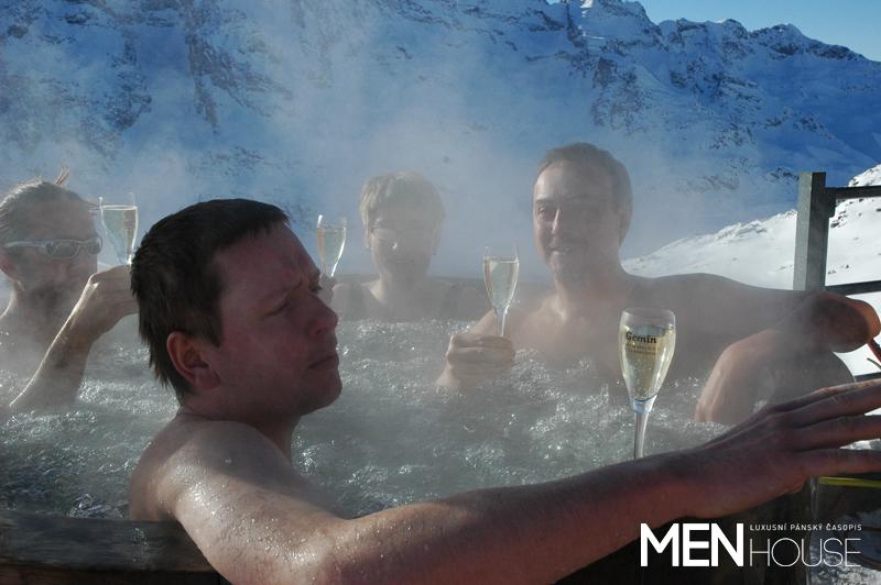 Zatímco obědváme, pod mosaznou kádí plápolá oheň. Konečně je voda teplá 41 stupňů, rychle se převlékáme do plavek, přehazujeme přes sebe koupací plášť a vydáváme se směrem k vyhřáté lázni. Odhazujeme plášť a po schůdkách se dostáváme dovnitř bublající vířivky. Číšník nám přináší šampaňské, které jsme si za deset franků objednali, a my si připíjíme na zdraví.